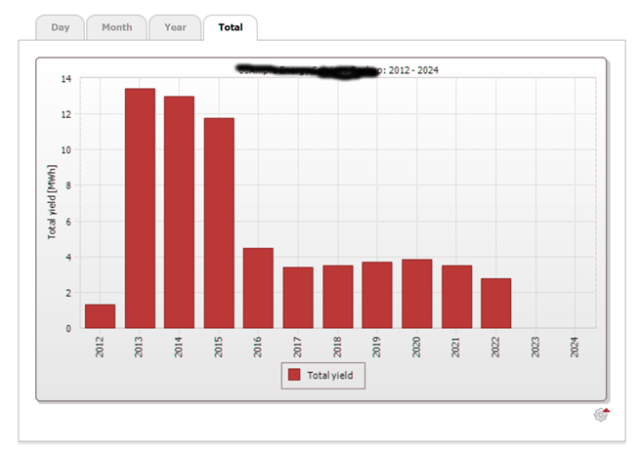 Based on the data below, all of these systems, whichever make or brand, were bad investments and should have had maintenance interventions. As reported recently, tens of thousands of solar installer companies have exited business in the UK, meaning the warranties on systems like this probably went with them.