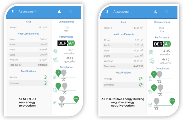 IE Example of Provisional PRS Apartment (47 sqm) Energy Ratings, A1 Net Zero and A1 PEB. (click to enlarge)