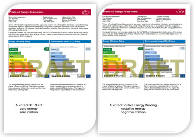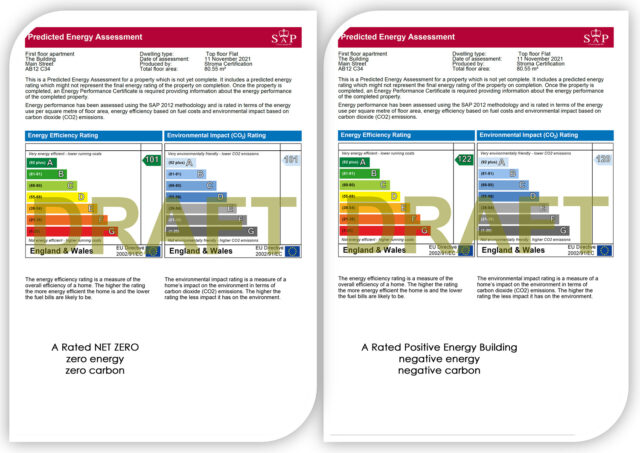 UK Example of Provisional PRS Apartment (80 sqm) Energy Ratings, A Net Zero and A-Rated PEB. (click to enlarge)