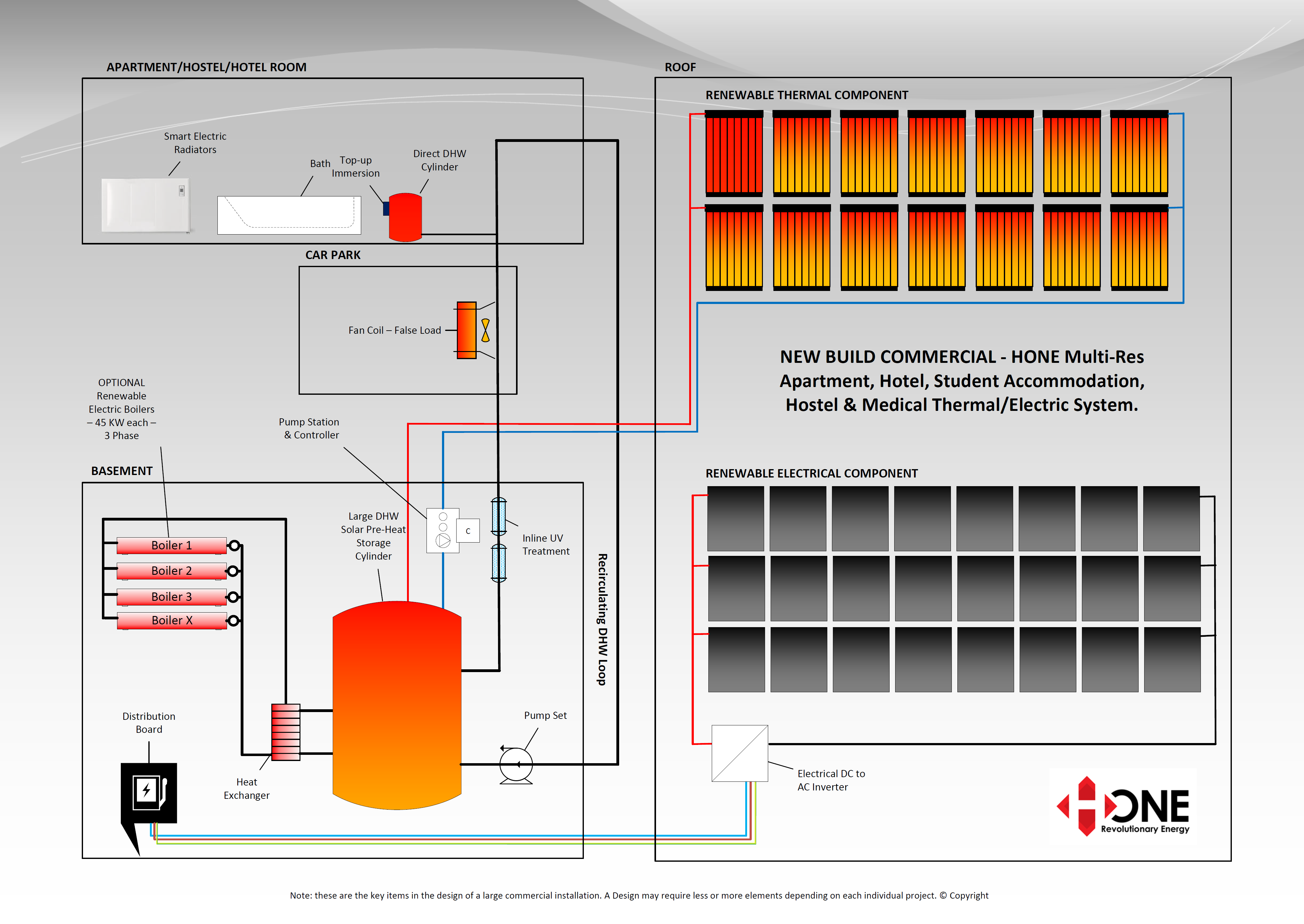 - HONE Renewable Electricity system. (which can go into landlord services, EV charging services can act in a Hybrid format with the Renewable Thermal DHW system)