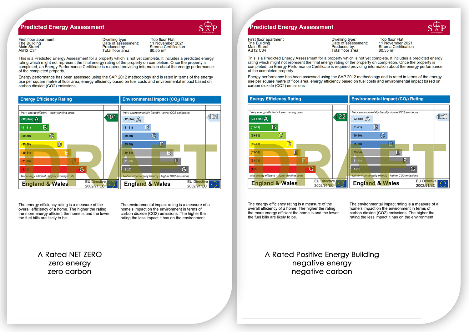 UK Example of Provisional PRS Apartment (80 sqm) Energy Ratings, A Net Zero and A-Rated PEB. (click to enlarge)
