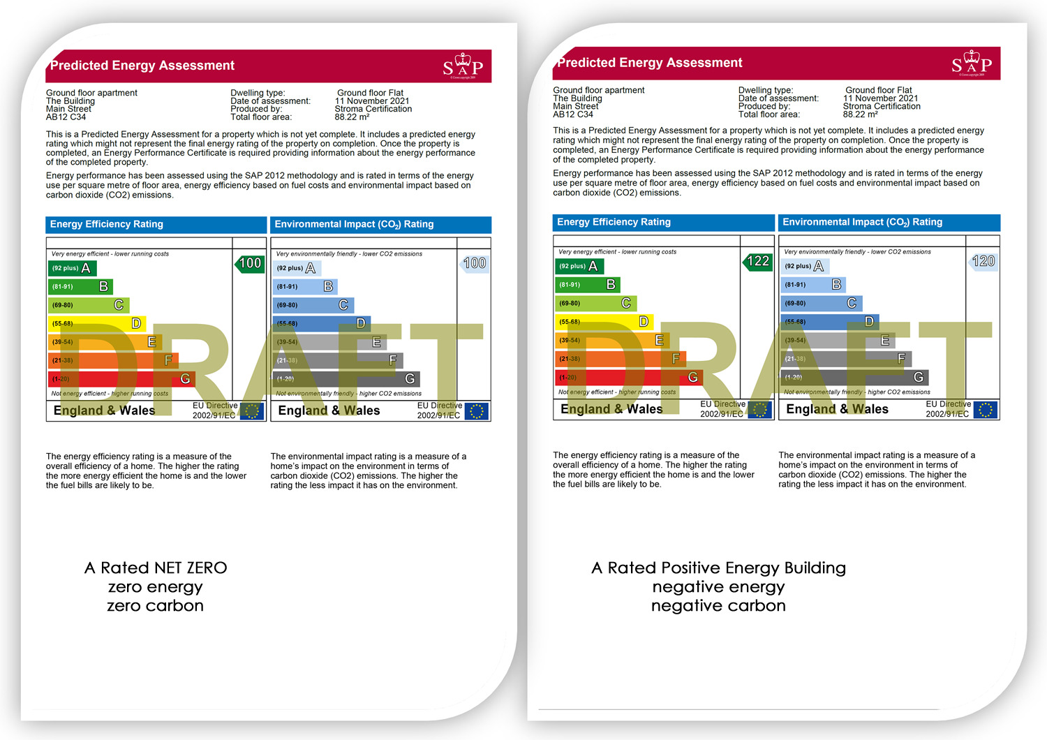 UK Example of Provisional Apartment (88 sqm) Energy Ratings, A Net Zero and A-Rated PEB. (click to enlarge)