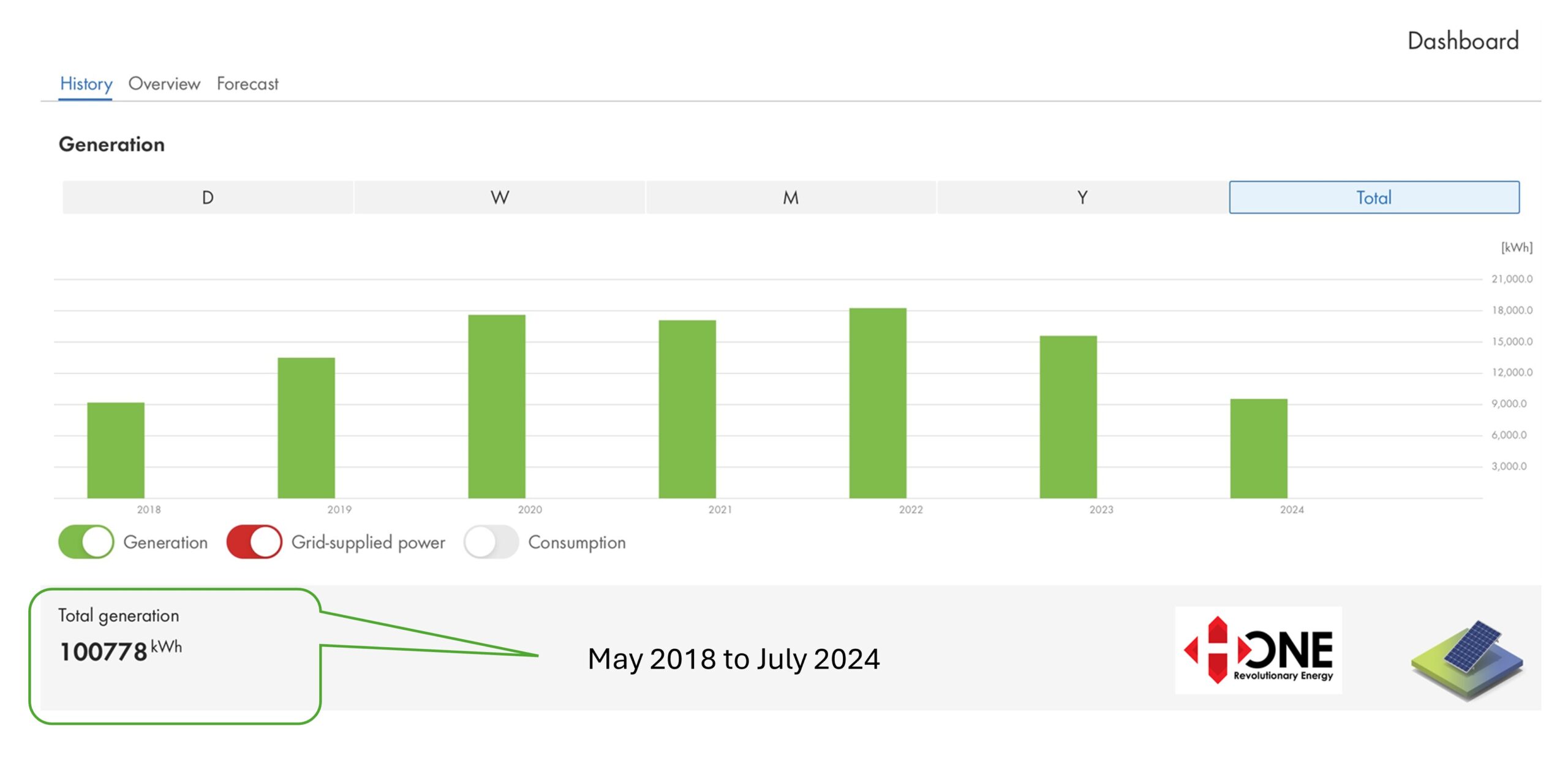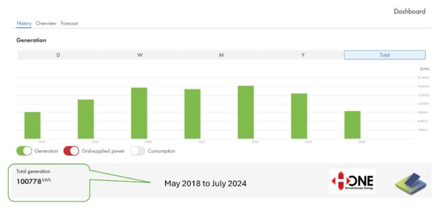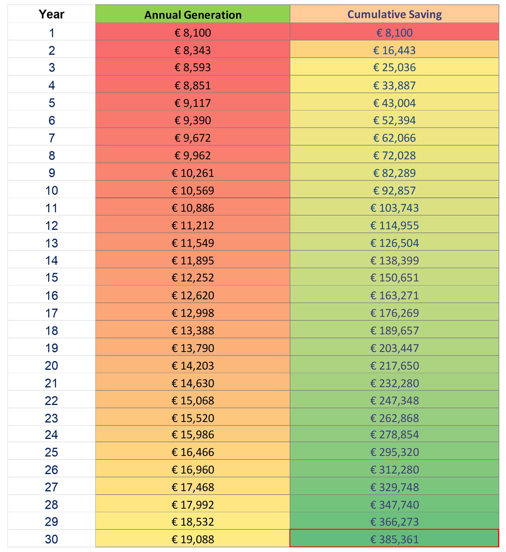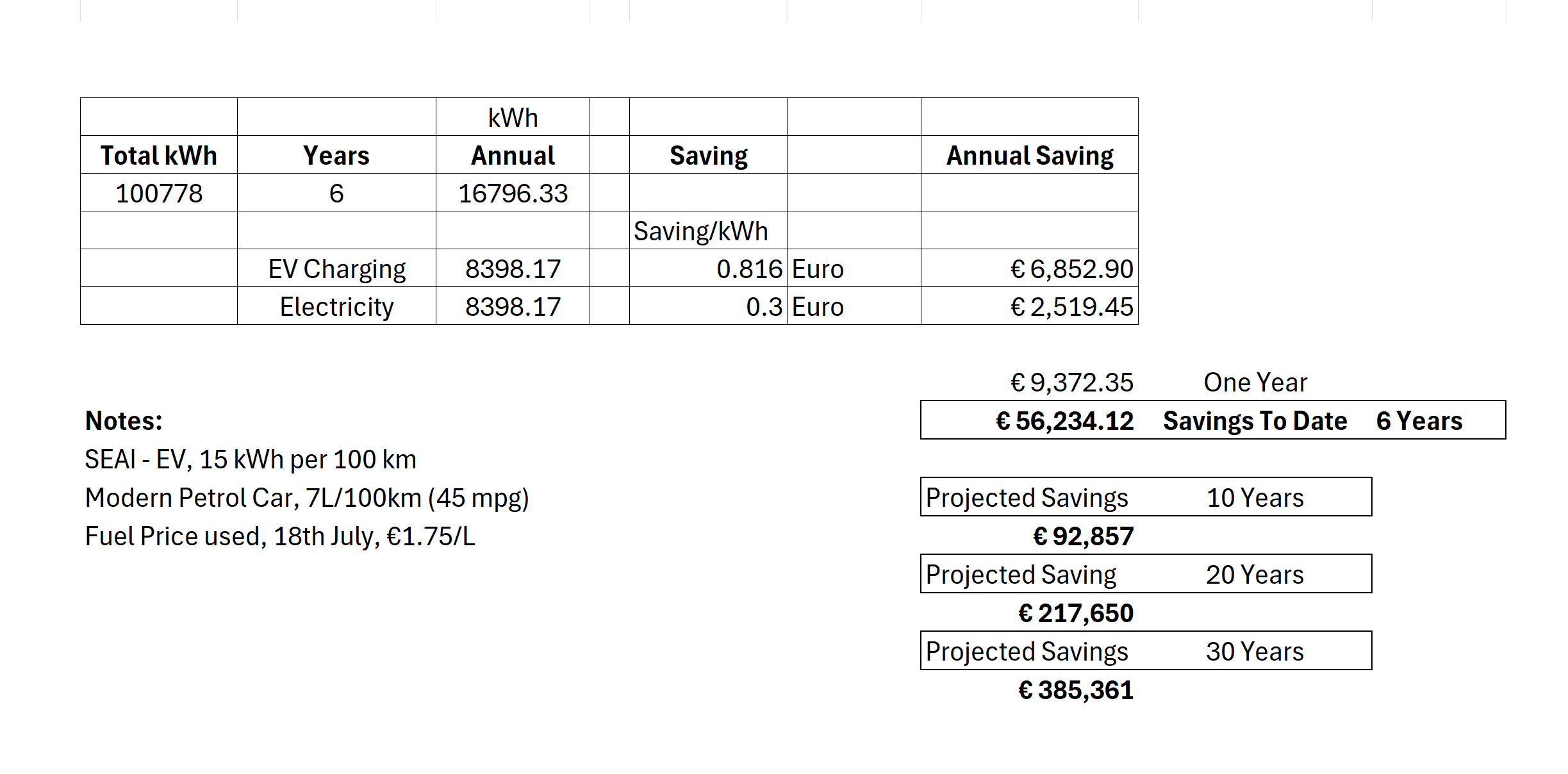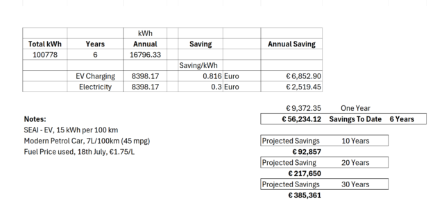 Over these 6 years, the system has consumed 100,778 kWh roughly split evenly between EV charging and electricity usage. Not a single unit of electricity has been purchased from the grid since April 2018. The system has generated savings of €56,234 at current prices. Calculating with a 3% inflation rate for energy and money annually, the savings are projected to reach €92k by year 10, €217k by year 20, and €385k by year 30.